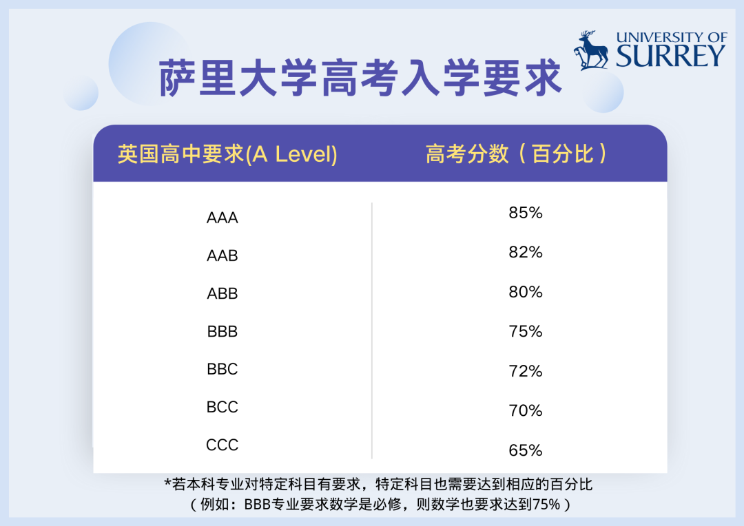 22年秋季入学萨里大学继续接受学生直接使用高考成绩递交本科申请,下面2022年入学英国高中A Level成绩对应的高考百分制分数要求,不同专业的入学要求请点击下面阅读原文进入具体的专业页面查看。 *请注意:部分专业对于特定科目有要求