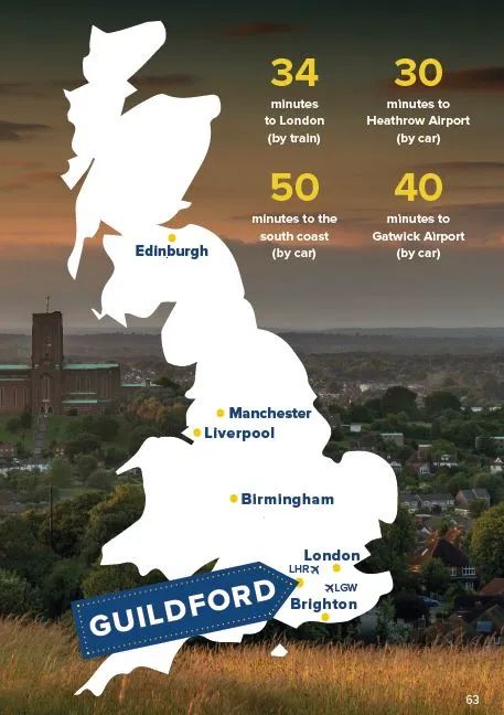 萨里大学位于英格兰东南部的萨里郡吉尔福德, 大学距离伦敦市中心只需要34分钟火车车程,距离希思罗机场仅需30分钟车程。萨里郡是英国最小的郡,被认为是全英国每平方公里最富有的郡,也是英格兰森林最茂密的郡。吉尔福德是萨里郡郡治所在地,是一座充满活力的古城,位于萨里郡乡村连绵起伏的丘陵中,城市中心还保留着中世纪城堡和传统的卵石大道。大学拥有美丽且充满活力的校园,被评为全英最安全的大学校园之一。