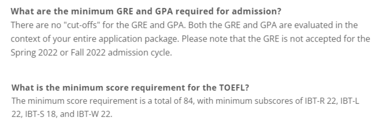 虽然学校官网要求TOFEL最低84+(其中R22、L22、S18和W22),对于GPA和GRE没有设定最低标准。