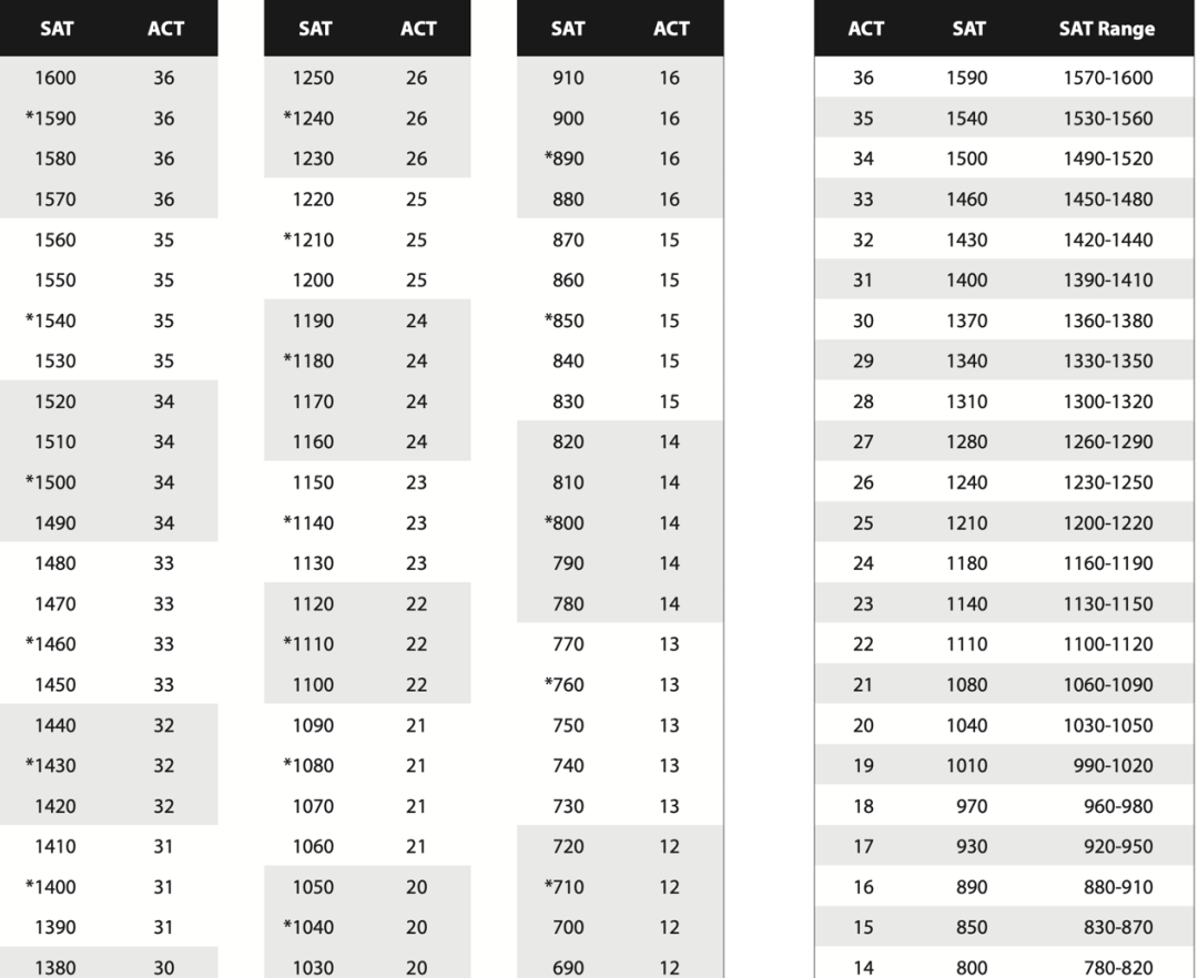两个考试的组织方一起进行了两种考试分数的一致性研究,提供了两种分数进行对比的表格。我们可以进行大致的对比。
