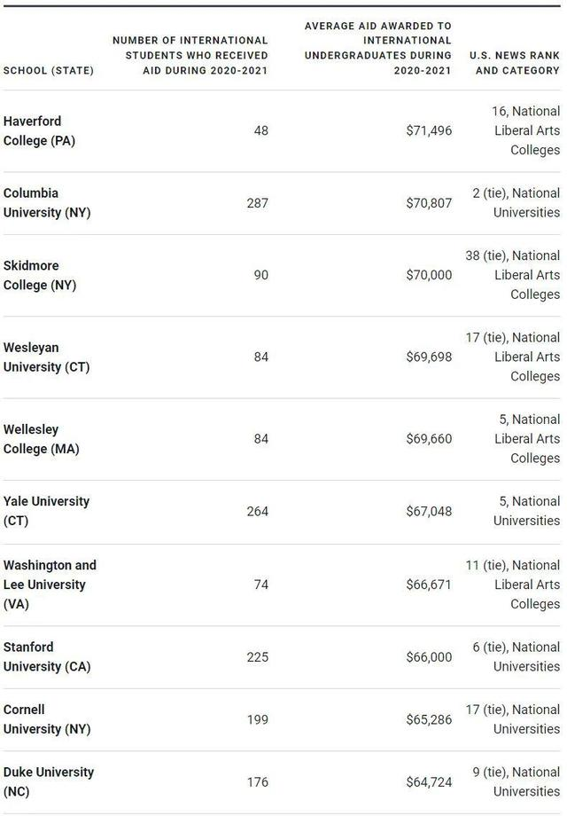 上图来自U.S.News的年度调查,调查对象包括美国本科院校890所提供的2020-2021学年对国际生的经济援助数据。平均援助金额约为20,867美元,且10所对国际学生提供奖学金最友好的大学中,平均金额超过了64,700美元。留学生如果能申请到这样的奖学金,那么即使家境一般,也可以轻松的负担起美国留学的费用了。下面我们就一起看看是哪些学校奖学金给的这么大方吧!