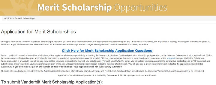 范德堡大学USnews综排14,为2019年攻读本科学位的优秀学生开设Merit-base奖学金,不限国籍,不限专业,奖学金分三种类型,Cornelius Vanerbilt Scholarship、Ingram Scholarship Program、Chancellor’s Scholars。国际生托福不低于100分,雅思不低于7.0。截止日期:2018年12月1日