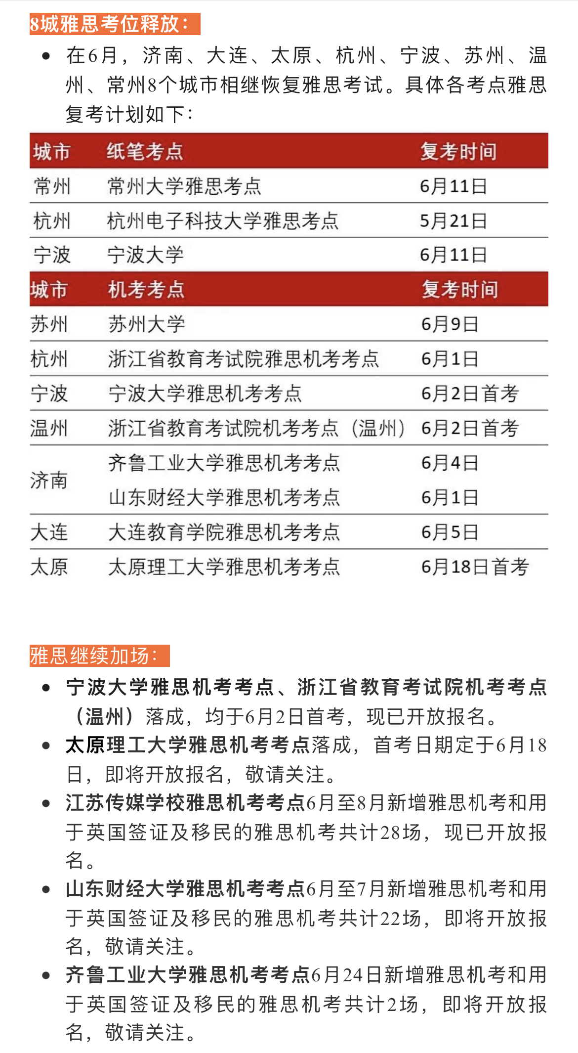 根据雅思官方的最新消息显示,于6月起,8城即将恢复雅思考试。出于防疫的需要,考点多不接受考前14天内有外省、市旅居史考生入校,请考生在考前14天内尽量避免不必要异地行程以免影响学生顺利参加考试。