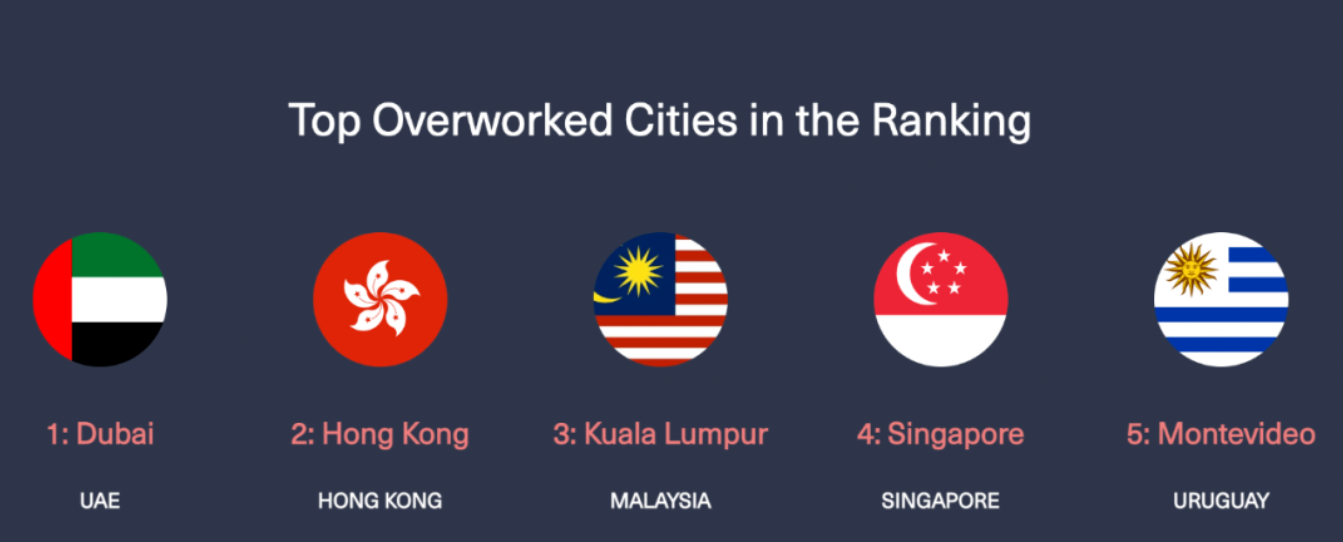 迪拜和香港则排到榜单的最末尾,这些城市被认为是典型的过度工作城市。