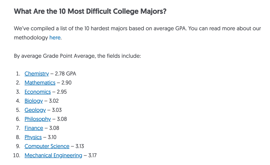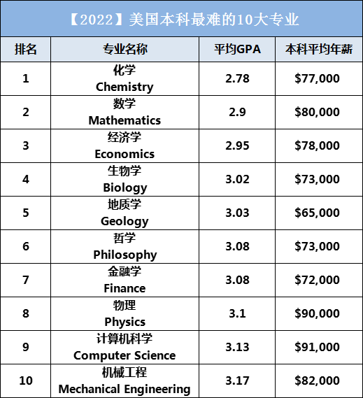 此前美国学位指导网站MyegreeGuie结合一份对美国5000名本科生进行的专业平均GPA调查,整理出了2022美国本科最难专业TOP10。