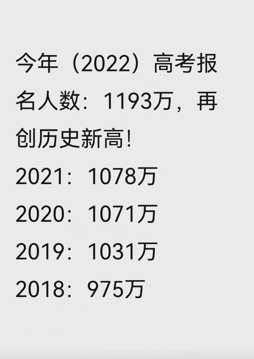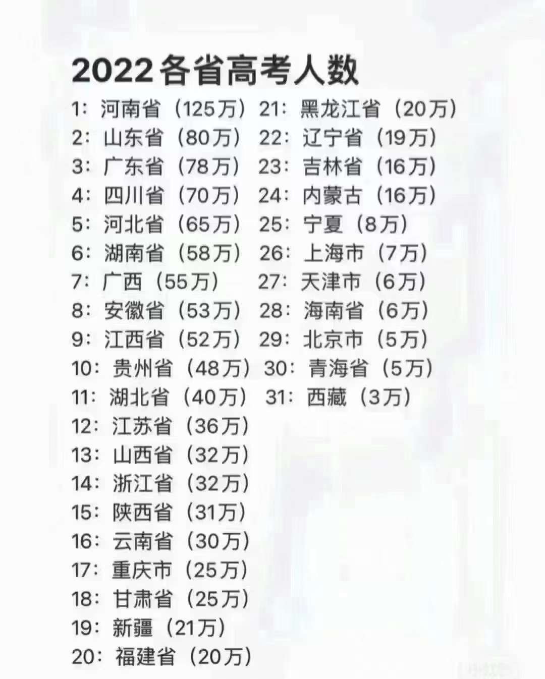 今年高考总报名人数已经出来了,总计1078万人,相比较去年的1071万人,虽然也是历史新高 ,但是这个人数不得不说还是并没有太大的增加。 要知道去年的报名人数,可是比前年增加了40万人。 但是尽管总报名人数增加的不是很多,可是我们国家有几个省份依然是报考的大省,比 如说河南省、河北省、山东省还有广东省 。 高考的竞争力在这几个省份依然是非常高的,考生们的压力也比较大。 今年河南省依旧以125万的高考报名人数, 排在了第一名的位置上, 这个省的竞争还是成为了“重灾区” ,和其他地区相比的话,河南可以说是“地狱模式”了。