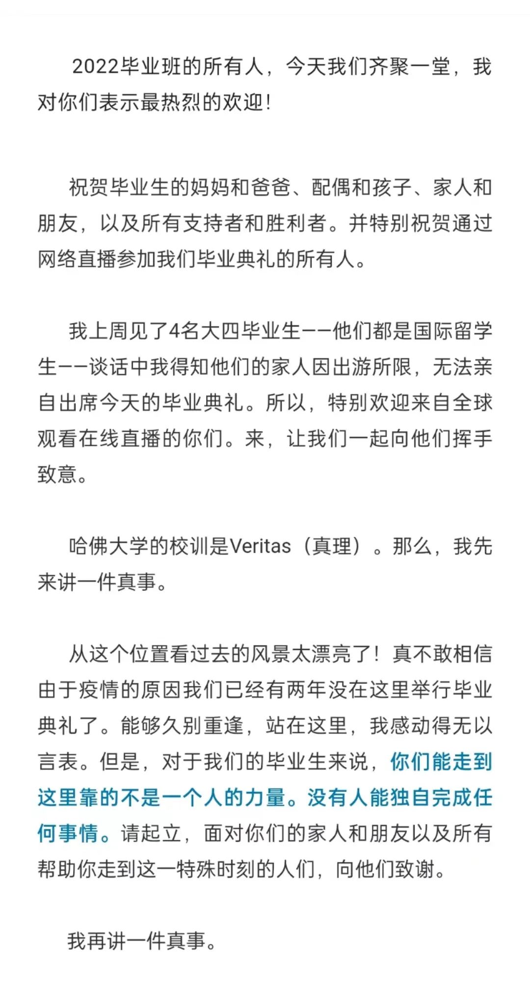 Lawrence提醒各位毕业生:“身为哈佛大学走出去的一员,你们在个人得到座位之时,也要学会为别人留出位置,因为“谦逊、善良、关怀他人,与一个人的专业成就一样重要。”