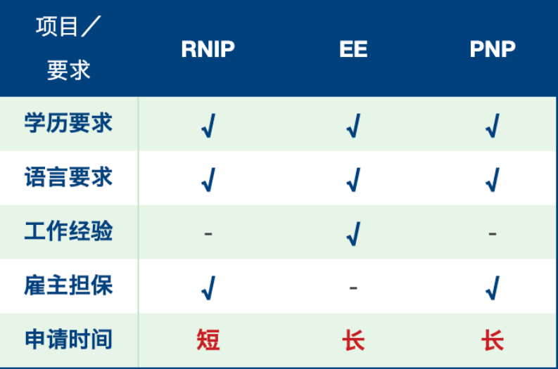 我们对RNIP、EE和PNP三个移民项目的要求进行了简单的比对,方便各位小伙伴直观看出它们的区别:
