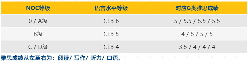 对申请人的语言要求会根据Job Offer的职业而有所差别,所有职业将会根据加拿大国家职业分类(National Occupation classification,简称NOC)*等级而进行划分,详细NOC等级对应的语言成绩要求如下: