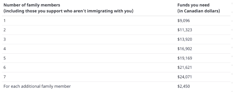 申请人需提交定居资金证明自己有足够的的经济能力在所申请的试点社区内定居,定居资金的数额取决于家庭人数,即便家人不随行移民,也要计算在家庭人数内,下图为2022年最新的定居资金要求金额(货币单位为加元)。