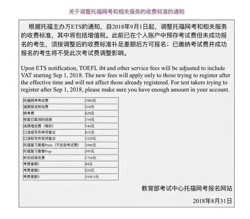 根据 ETS 托福主办方通知, 自 2018 年 9 月 1 号起 ,调整托福网考和相关服务的收费标准,其中将包括增值税。详见托福首页《报名须知》中的《报名流程》。此前已在个人账户中预存考试费但未成功报名的考生,须按调整后的收费标准补足差额后方可报名 ; 已缴纳考试费并成功报名的考生将不受此次考试费调整影响。