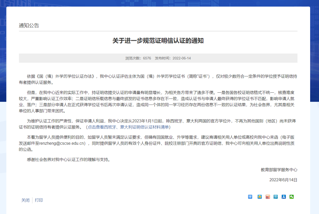 简单来说就是 从 2023年1月1日起,除西班牙、意大利两国外,不再为其他国别(地区)尚未获得证书的证明信持有者提供认证服务。