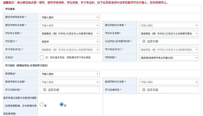 下一步填写个人信息,学校信息和学习经历。学位信息根据毕业证书的内容填写准确,如有远程学习需要如实填写。