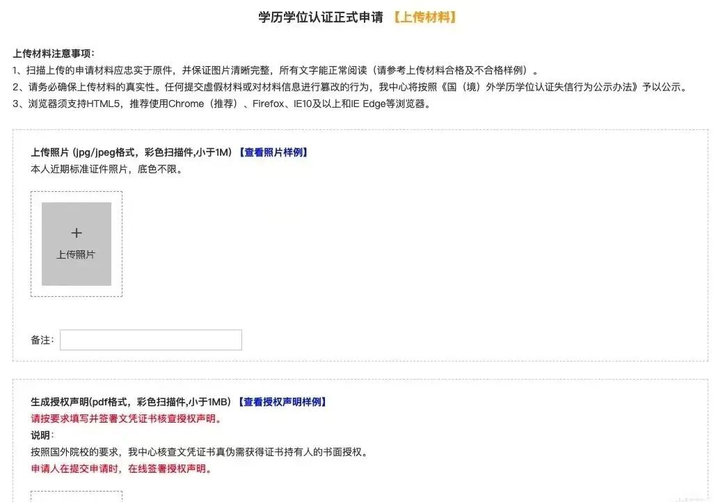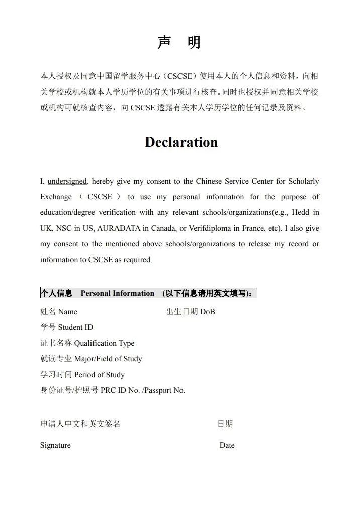 需要注意的是,上传文件中也需要包含授权声明,它是留学服务中心核查文凭证书真伪需获得的书面授权。申请人应使用英文或留学国源语言填写,且务必由本人亲笔手写签名,以保证核查效力。