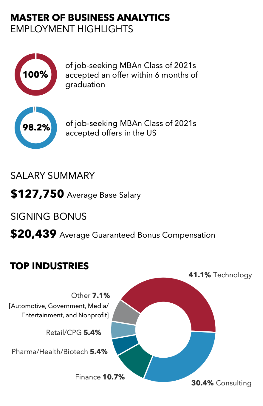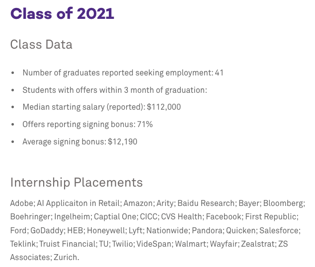 平均薪资: $112,000 (+ sign on bonus $12,190) 就业率: 100% (Class of 2021)就业服务: 是否涵盖夏季实习: 是 是否有专门的 career fair :是
