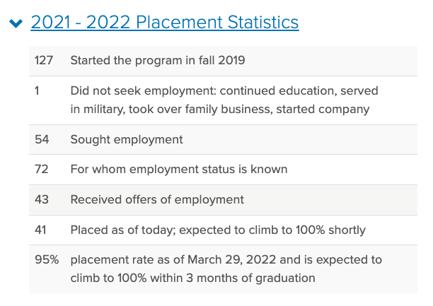 就业数据: 平均薪资: $117,116 (+ sign on bonus $21,045) 就业率: 100% (Class of 2021)