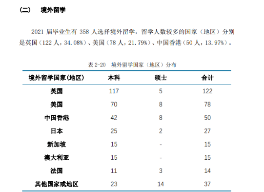 2021 届毕业生有 358 人(本科+研究生)选择境外留学。