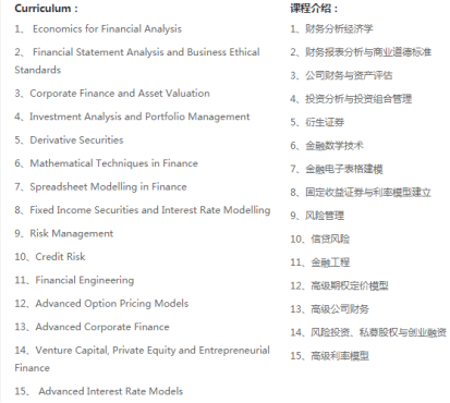 课程描述:金融硕士课程是一项跨学科课程,旨在为有动力的人提供金融理论方面的前沿培训以及必要的数学,统计和计算机培训,使他们能够在充满挑战的本地和全球金融环境中竞争。该专业强调知识进步的实际应用。其统计和数学培训侧重于为理解现代金融理论提供必要的定量背景。其财务培训强调了强大金融模型发展的经济概念及其风险管理含义。其计算培训强调将这些理论实际转化为套利者,套期保值者,投机者,投资组合经理,风险管理者和监管者常用的工具。整个专业旨在为学生在最广泛的背景下应用和管理最新金融技术提供竞争优势:投资和商业银行,单位信托和投资组合管理,保险,企业和项目融资,经纪,风险管理和财务规划。