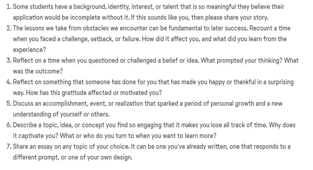 接下来,一起来看看Common App 2022-2023申请季的主文书题目和解析。