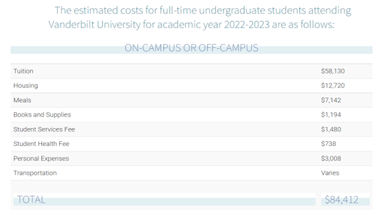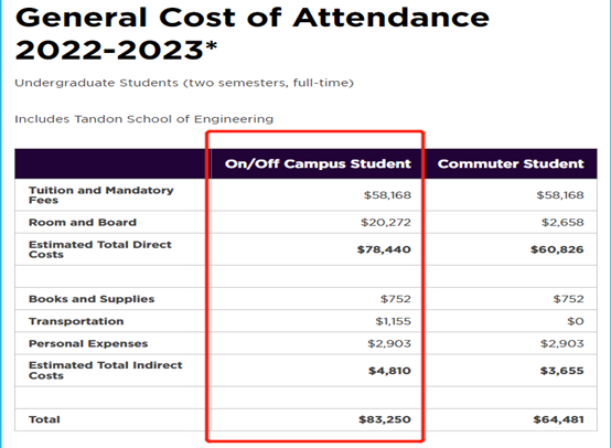 单单是每学期30万以上的学费就会让不少以工资收入为主的家庭望而却步,更别提申请前的考试准备费用、出国后的生活租房费用等等。 以纽约大学和范德堡大学的官方数据为例, 学生一年的预估花费约为8.4万美元(58万人民币) ,若是就读本科加硕士合共5年,花费可高达300万人民币。