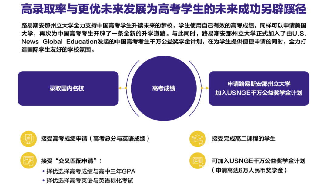 高考成绩已放榜,人生有好多选择,我们不要局限自己。最近有好多同学咨询高考成绩能够申请哪些学校?高考后的第二条升学路径系列之路易斯安那州立大学,接受高考成绩,还有高额奖学金!高二完成也可以申请!