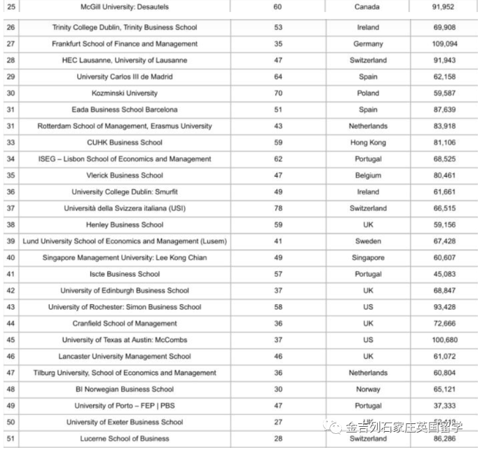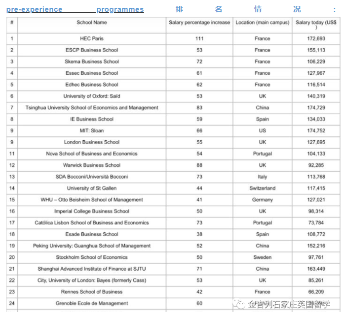 pre-experience programmes 排名情况: ** 55所学校中,* *各个国家/地区 *上榜情况:* 英国12所,法国7所,葡萄牙5所,中国(中国大陆3所,中国香港1所)、美国、西班牙、瑞士各4所,荷兰3所,德国、瑞典、爱尔兰各2所,新加坡、加拿大、比利时、意大利、波兰、挪威各1所。