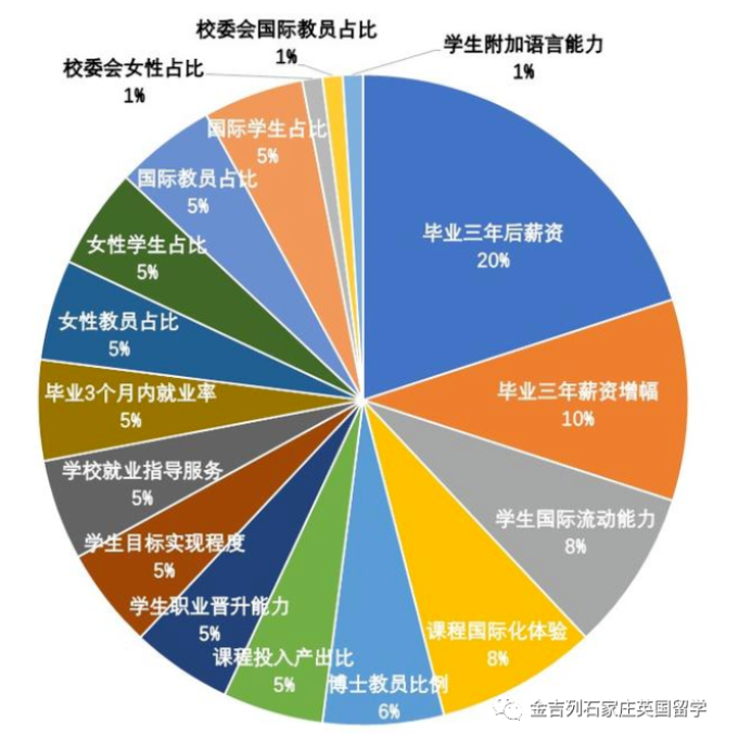 该排名包括 毕业后三年的平均校友工资、薪资涨幅、晋升幅度、职业发展水平 等19项指标,关注教学成果和学生在读体验。具体评估指标如下图: