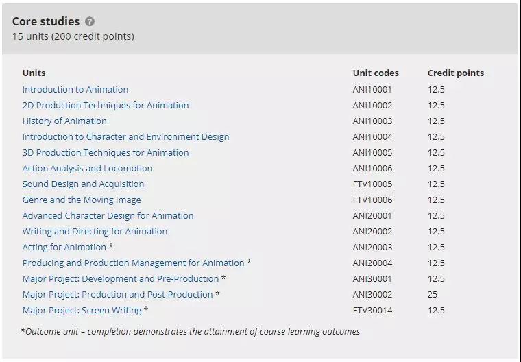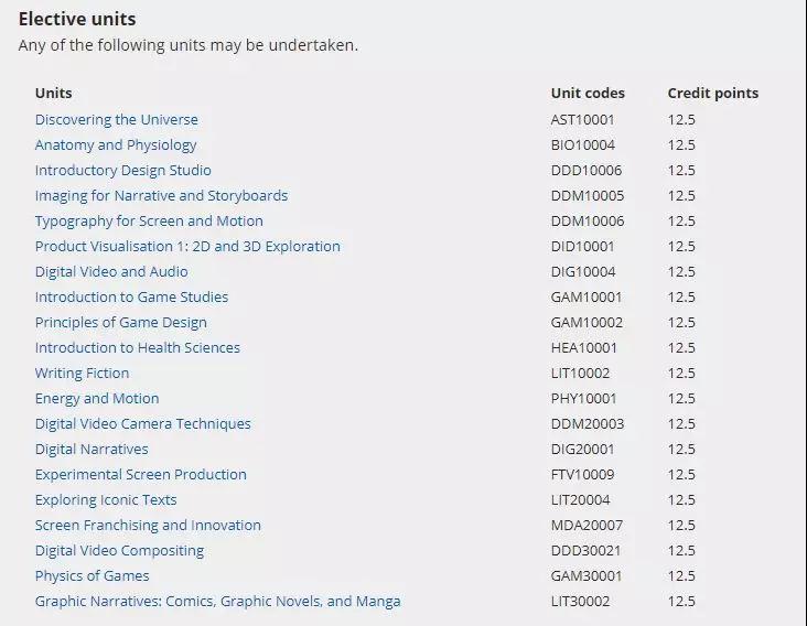以选修课程( Elective Units)为例(如下图),动画学并不仅仅是媒体影视技术与绘画美工的简单叠加, 成为一名优秀的动画人才,不仅需要有过硬的技术,还需要掌握一定的物理学定律、自然科学等相关知识。 这样,动画在表现过程中,才能够更加流畅,且拥有高度的现实感。