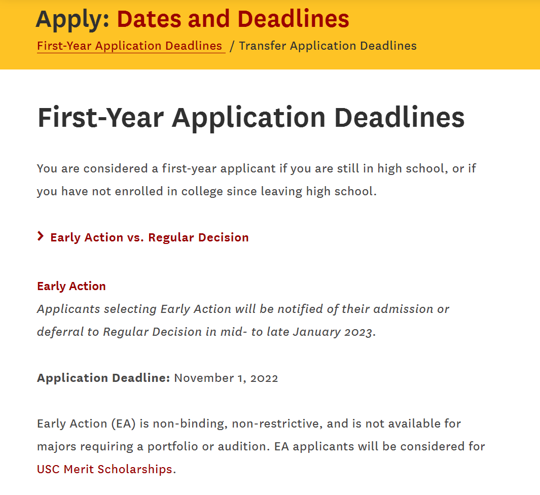 早申截止日期是2022年11月1日 ,2023年1月中旬发放录取。并且USC还透露,预计有20-25%的录取名额将在EA轮次中获得,虽然比例不高,但能提前锁定录取学校,还是会吸引不少申请者的。
