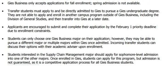 如果你已经明确了自己的专业方向,也需要满足对应专业学院的要求。以吉斯商学院为例,要求申请者在原学校修够24-50+学分,GPA的要求是3.6-4分(2019年秋季,录取学生的平均转学GPA为3.8分)。值得注意的是,学生在申请时只能选择一个商业专业,但是一旦被录取,就可以选择不同的专业或多个专业。
