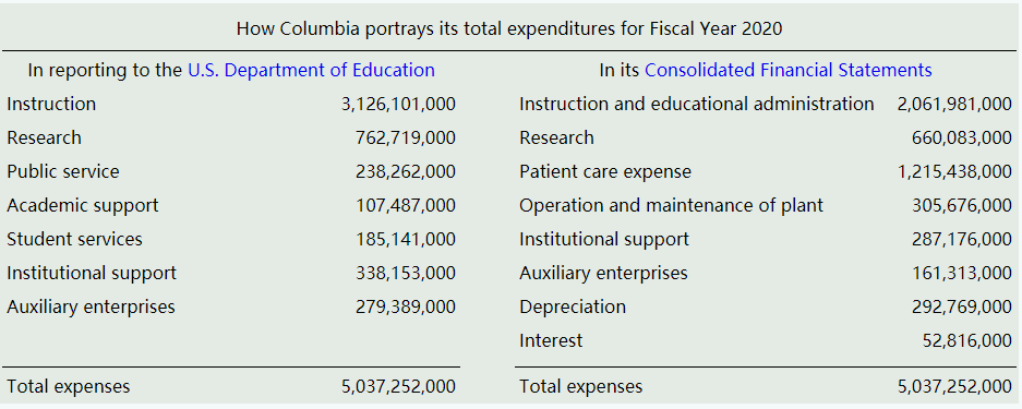 U.S. News榜单通过该指标衡量学校对于每个学生的教育投入,权重10%。 哥大声称花费巨额教学资金:2019-20学年的教学支出略高于31亿美元。然而,塞迪乌斯教授统计的各种财务数据表明,事实绝非如此!