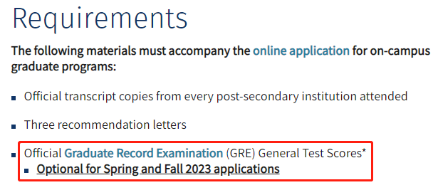 成绩单、ps、cv、三封推荐信、雅思/托福、GRE(2023为可选材料)、可能会有面试、申请费$85.