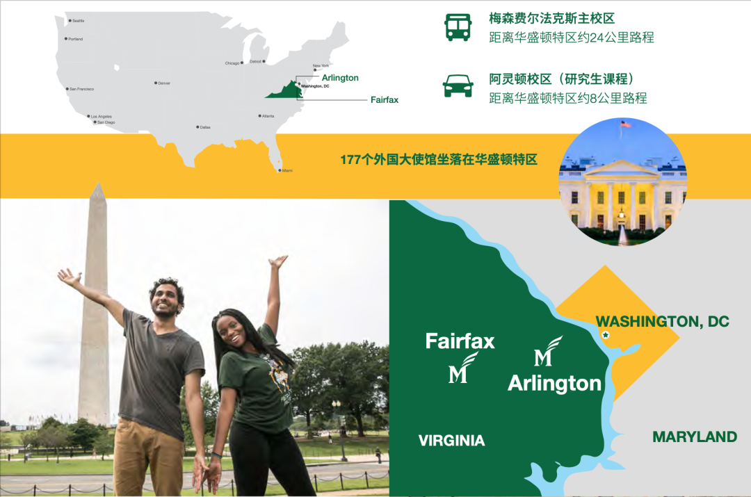 梅森费尔法克斯校区与亚马逊HQ2邻居阿灵顿校区是弗州技术人才的主要产地,结合美国首府的媒体、政治、商务和技术产业优势,为国际学生提供最佳的职业发展机遇。