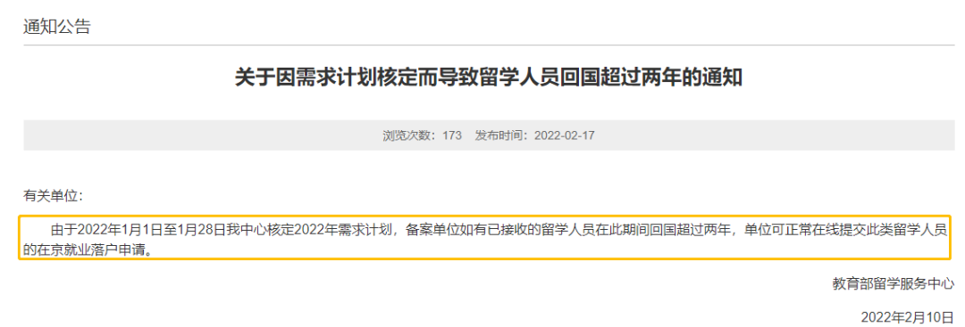 对于受疫情影响, 备案单位如有已接收的留学人员在此期间回国超过两年,单位可正常在线提交此类留学人员的在京就业落户申请。