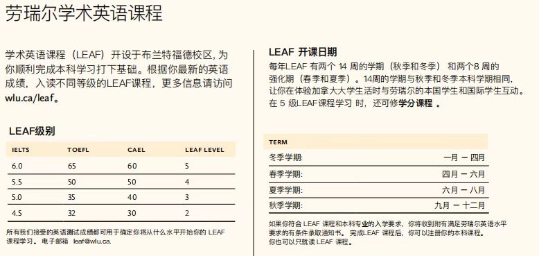 劳瑞尔英语和学术基础(LEAF)课程,为留学生提供学术英语培训,从而帮助学生们为未来的本科学习做好准备,同时也帮助国际生了解加拿大的生活和劳瑞尔的学术文化。