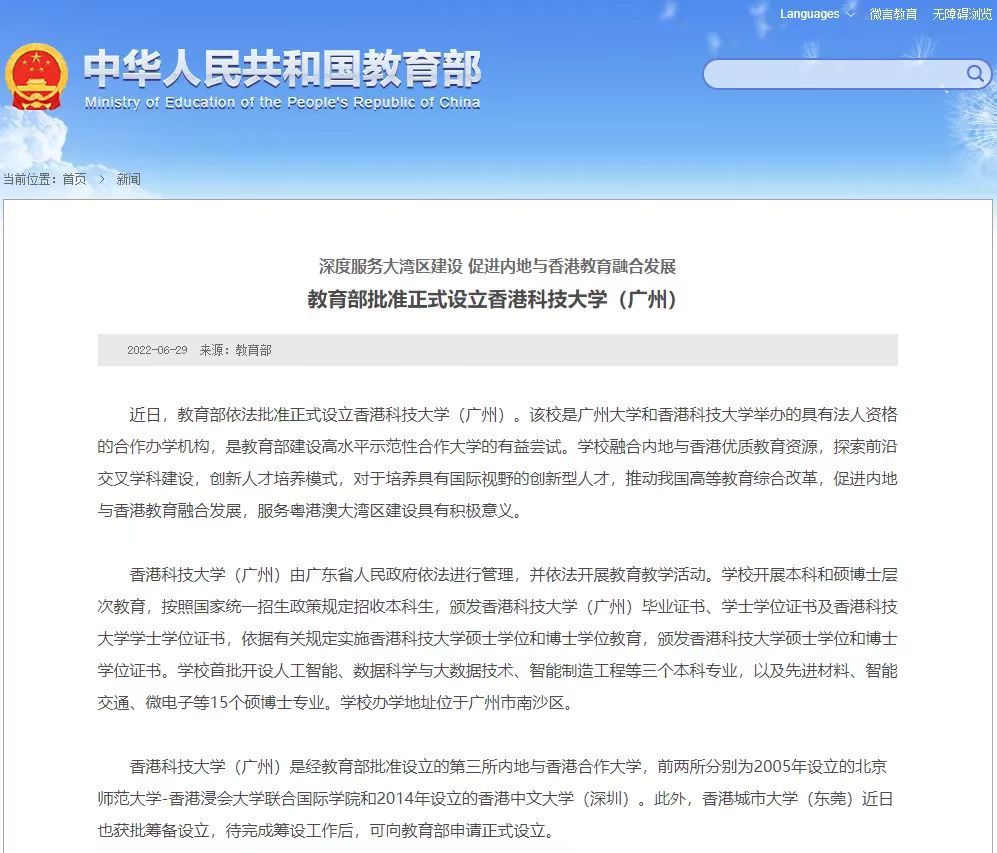 近日,教育部依法批准正式设立香港科技大学(广州)。该校是广州大学和香港科技大学举办的具有法人资格的合作办学机构,是教育部建设高水平示范性合作大学的有益尝试。学校融合内地与香港优质教育资源,探索前沿交叉学科建设,创新人才培养模式,对于培养具有国际视野的创新型人才,推动我国高等教育综合改革,促进内地与香港教育融合发展,服务粤港澳大湾区建设具有积极意义。