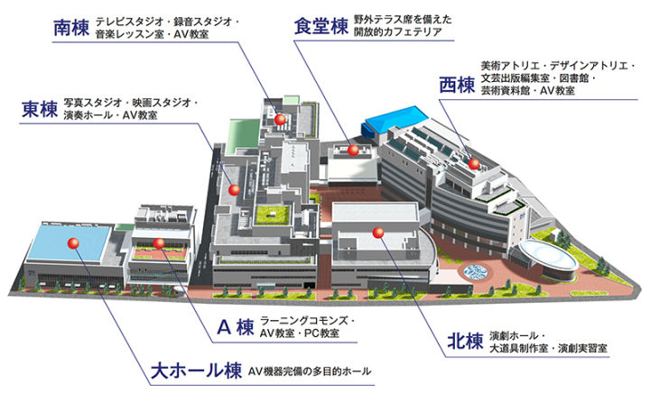 - 写真学科 -该专业主题包括三个支柱:&lquo;学习表达技术的实践&rquo;,&lquo;生产技术理论&rquo;、&lquo;用于表达和研究的表达理论&rquo;。- 美術学科 -该专业包括绘画(油画/印刷)和雕塑两个课程,并从技术习得和艺术理论两个方面进行全面研究。- 演劇学科 -戏剧专业目标是在理论知识和实践方面达到与时俱进,分为三个课程:A.理论/历史课程;B.研究课程和;C.表达技术课程。- 放送学科 -广播专业的课程从第一年开始就分阶段逐步进行,以实践训练为中心,逐步深化专业领域的学习。- 音楽学科 -音乐专业作为艺术综合系的音乐专业,分为作曲&miot;理论、音乐教育、声乐、钢琴、弦&miot;管打乐、信息音乐6个课程。- 文芸学科 -文学专业旨在培养文学创造力和表现力,它不仅是文学研究的场所,还涉及到广泛的新闻界,通过表现活动,主动理解&lquo;文艺&rquo;本身的学科。