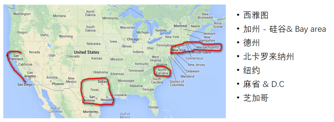 CS 相关的就业机会大都集中在美国东西部海岸和中部德州地区,就读于地理位置优越地区的同学在念书时就更容易获得实习机会,甚至拿到 return offer。