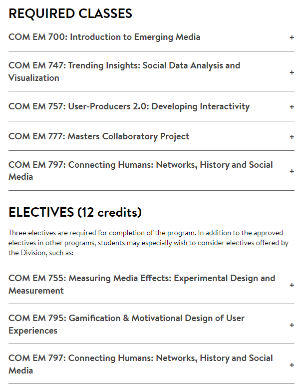波士顿大学新兴媒体研究文学硕士是 美国第一个新兴媒体研究生课程 ,它在现代日常生活中发挥着关键作用。它提供 10 个月的实践和理论指导,涵盖人类行为、社交媒体分析、组织沟通和大数据。 在该项目中,学生将使用关于新兴技术和服务、社交媒体分析技术以及公共政策对新通信技术的作用的最新研究和想法,来分析新兴媒体的世界。新兴媒体研究项目将课程与研究经验相结合,最终在会议上让学生展示他们的研究并与该领域的同行和领导者交换意见。 学生们还可以通过为期一个学期的研究项目帮助现实世界的客户解决商业和社会挑战。