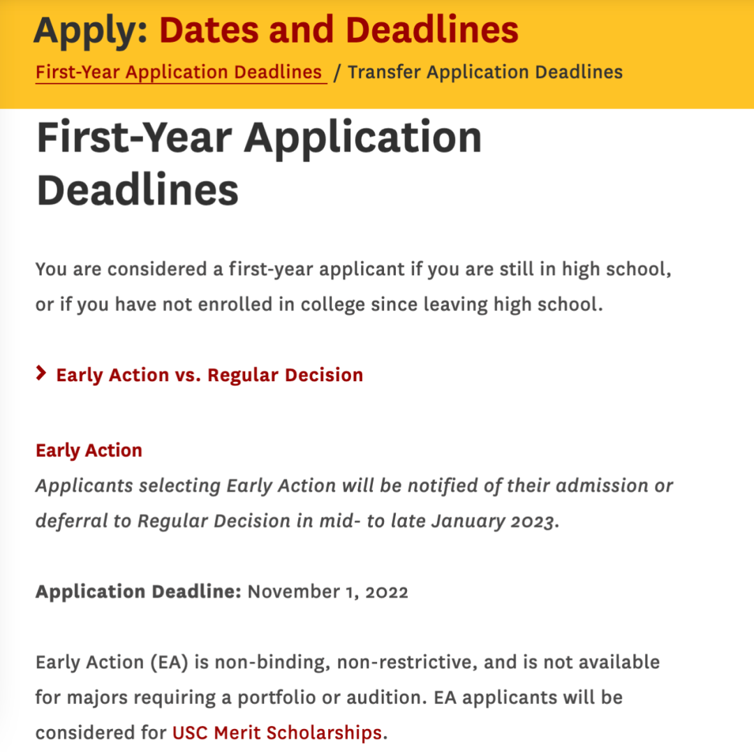南加州大学往年只有一个申请轮次,那就是Regular Decision,绝大部分专业的RD截止时间都是1月15日。申请RD的学生有更多时间来准备自己的申请材料,当然,他们获得申请结果的时间也更晚。