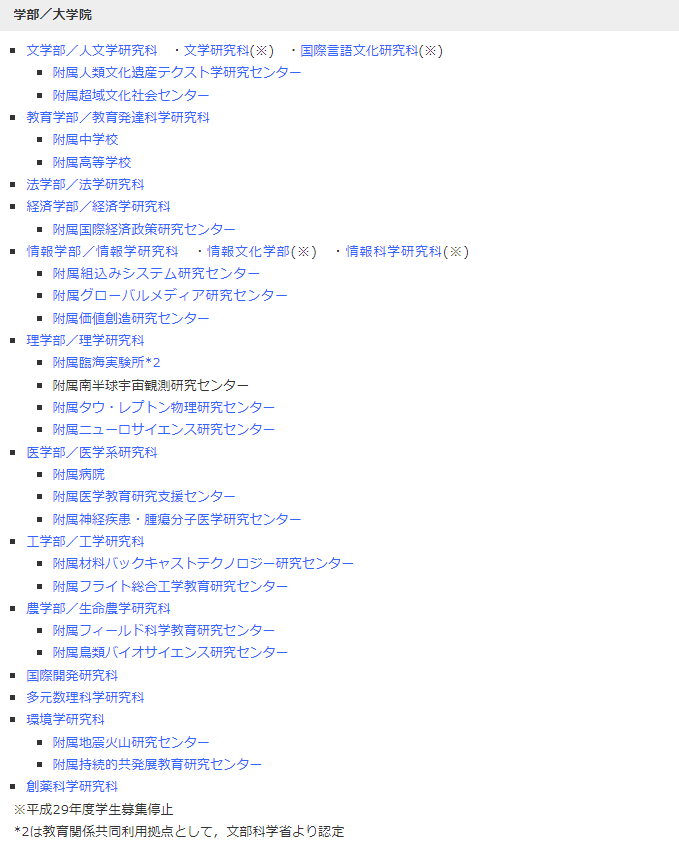 名古屋大学现拥有10个学部、15个研究科、3个研究所、2所全国共同利用共同研究基地和29处校内共同教育研究设施。