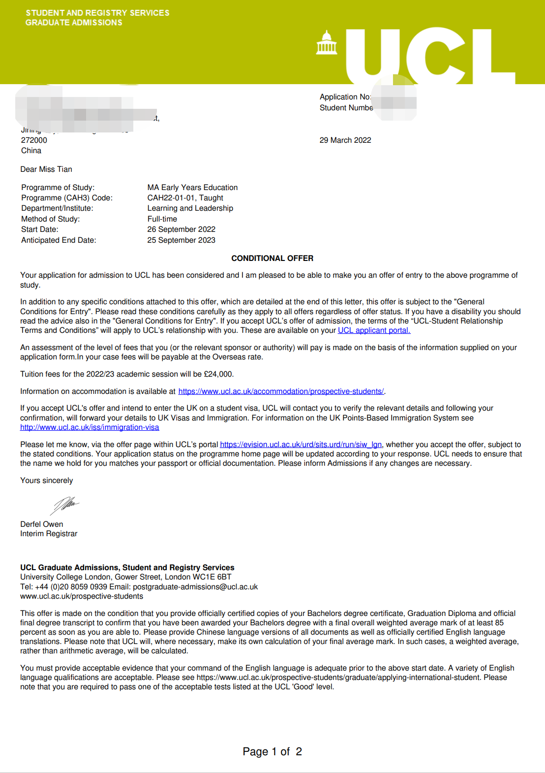 录取结果 : 伦敦大学学院
