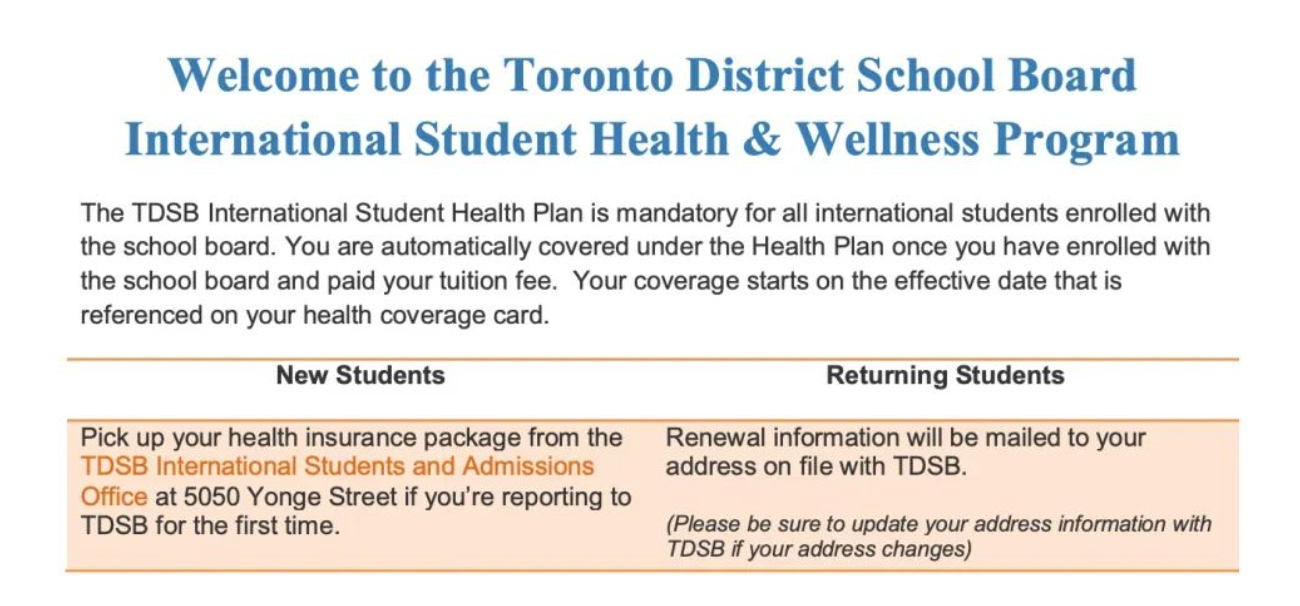 以安大略省的多伦多公立教育局TDSB为例,学校官网指出,国际留学生必须有医保,但只要是注册在TDSB名下的学生,健康保险都自动包含在了学费中。