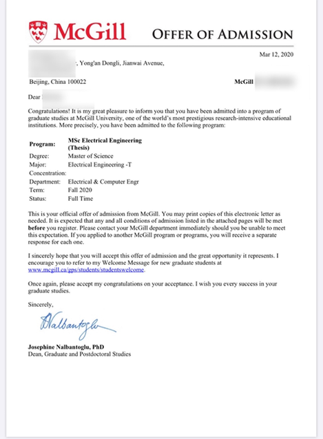 最后在申请的学生中很好的扬长避短,将优势发挥到了最大值,顺利拿到麦吉尔大学的录取通知书!