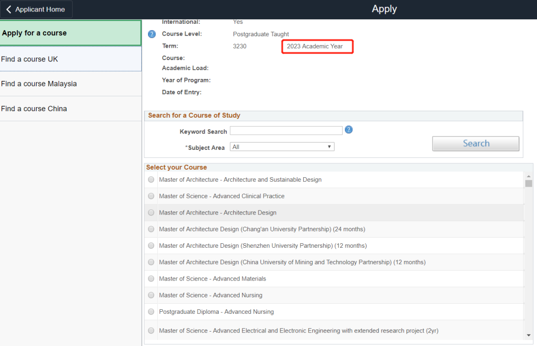 目前诺丁汉大学的网申系统已经可以选择 2023 入学,并可选择除商学院之外的项目提交网申。