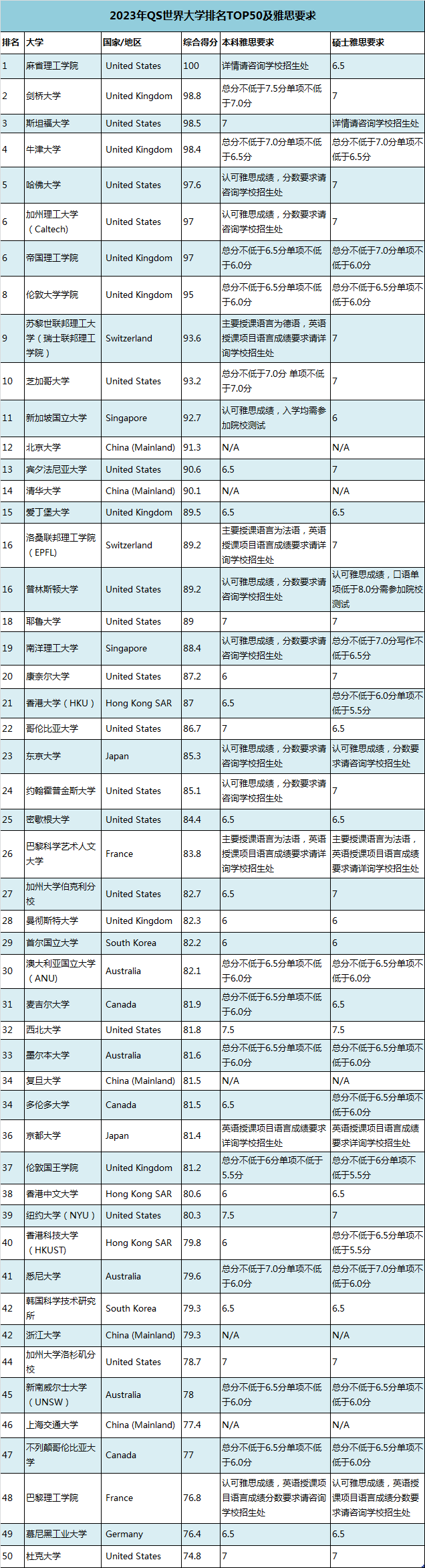 我为大家整理了 2023年QS世界大学排名TOP 50院校的雅思要求 !