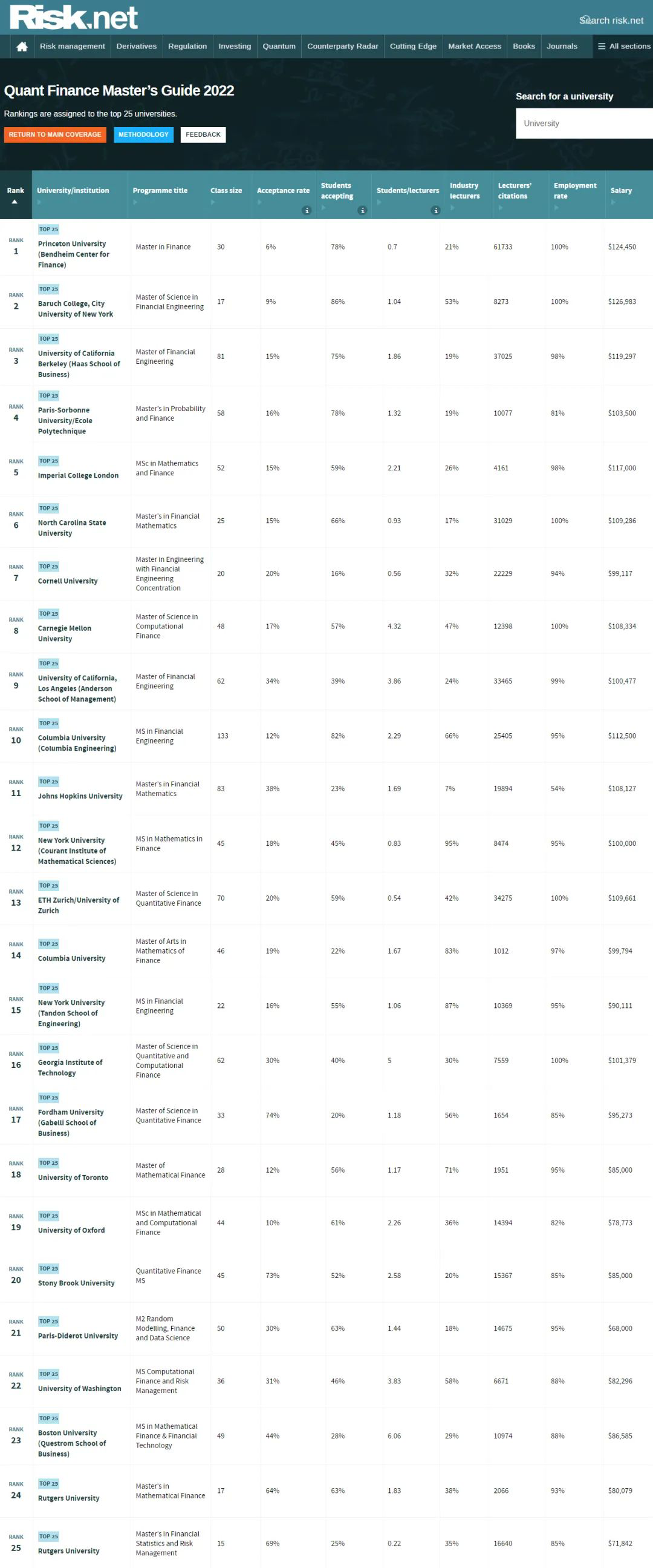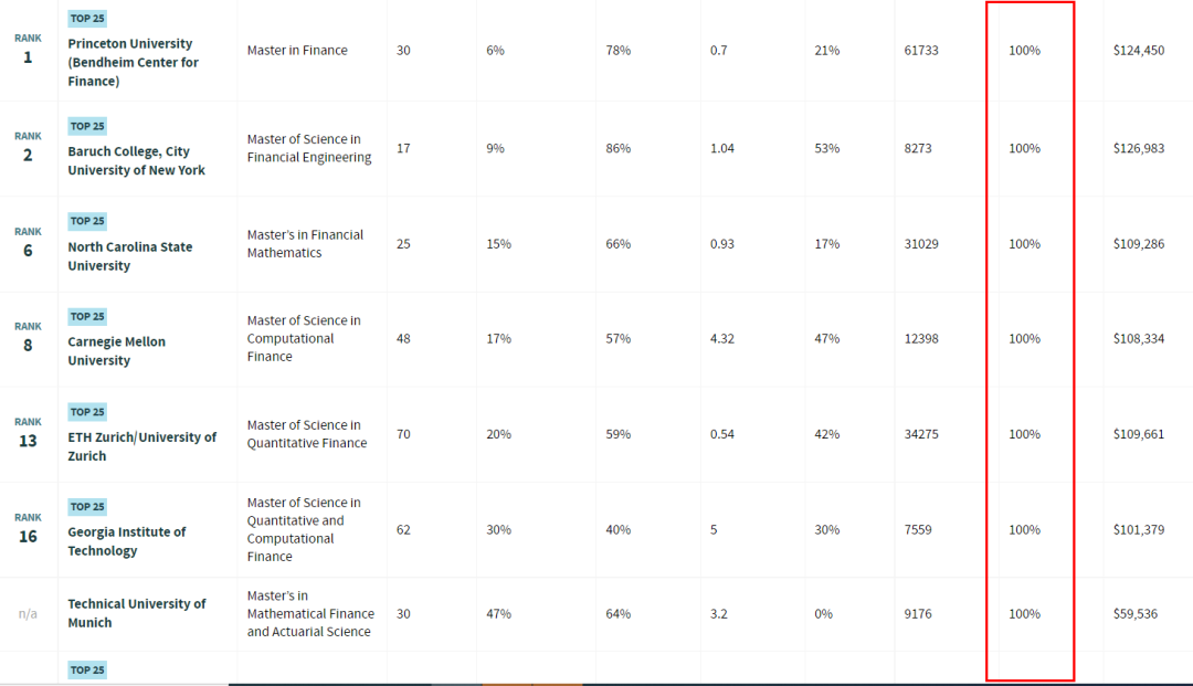 在Risk.Net榜Top25中,就业率在90%以上、薪资高于10万美元的学校有:普林斯顿大学、巴鲁克学院、加州大学伯克利分校、帝国理工学院、北卡罗来纳州立大学、卡内基梅隆大学、加州大学洛杉矶分校、哥伦比亚大学、苏黎世联邦理工学院、佐治亚理工学院以及纽约大学的MS in Mathematics in Finance项目(纽约大学有两个项目上榜)。