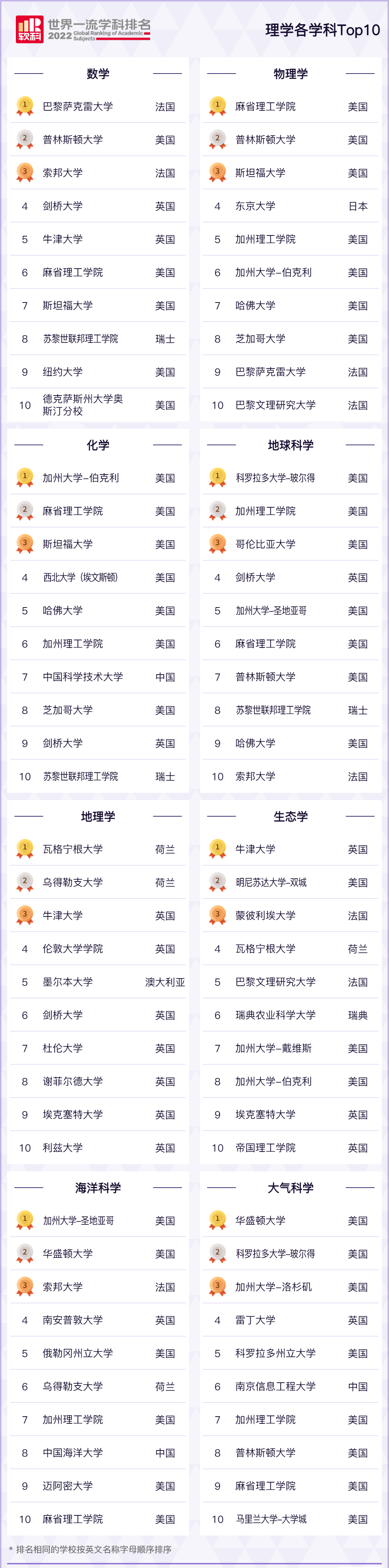 理学 排名中,美国、英国、法国的大学排名相对靠前。在海洋科学领域, 美国两所高校一直不分伯仲 :去年位列第一的 华盛顿大学-西雅图 在今年退居第二,TOP1则由去年次位的 加州大学-圣地亚哥 取代。