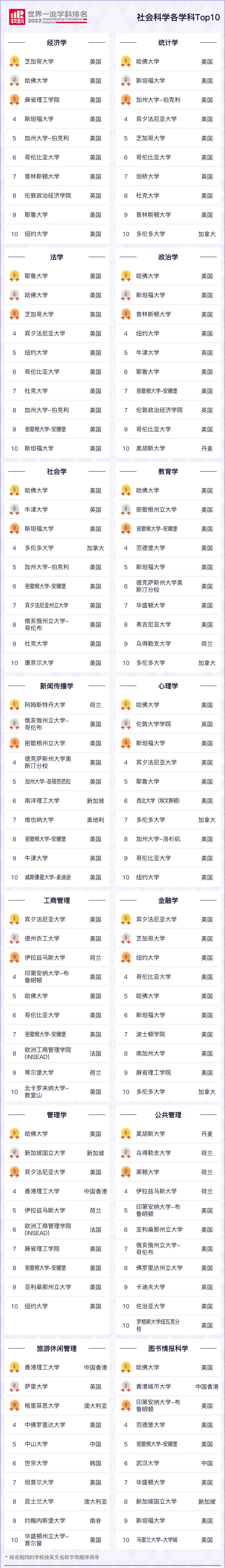 在 社会科学 专业的全球排名中,热门学科之一的管理学中,由美国哈佛大学 摘取桂冠 。另一个热门学科金融学中, 加拿大多伦多大学 堪称黑马 ,空降TO10;荷兰阿姆斯特丹大学、美国俄亥俄州立大学、美国密歇根州立大学的新闻传播学专业分别位列前三。