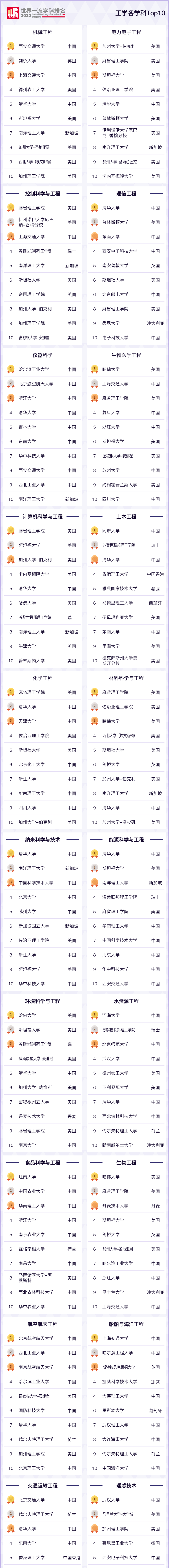 此次 工科 学科排名, 美国和中国依旧包揽了大部分的头部位置 。其中,美国占据了8个专业的TOP1,麻省理工学院表现最优;中国占据了14个专业的TOP1,清华大学表现瞩目。